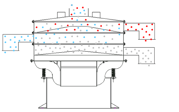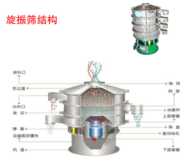 旋振篩是由直立式電機作激振源,電機上、下兩端安裝有偏心重錘,將電機的旋轉(zhuǎn)運動轉(zhuǎn)變?yōu)樗健⒋怪薄A斜的三次元運動,再把這個運動傳遞給篩面。調(diào)節(jié)上、下兩端的相位角,可以改變物料在篩面上的運動軌跡。