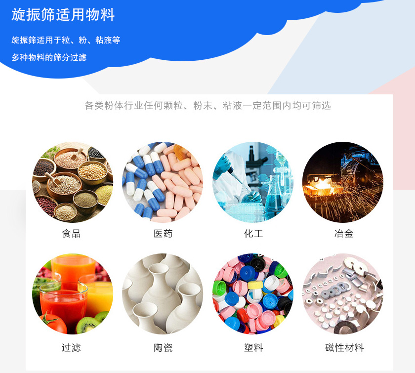 旋振篩適用于粒、粉、粘液等多種物料的篩分過濾。對于一些高精度、易團聚的粉末物料則會出現(xiàn)粘網(wǎng)現(xiàn)象。