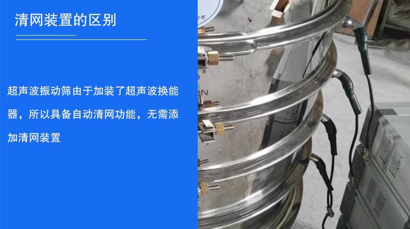 超聲波振動篩由于加裝了超聲波換能器,所以具備自動清網(wǎng)功能,無需添加清網(wǎng)裝置。