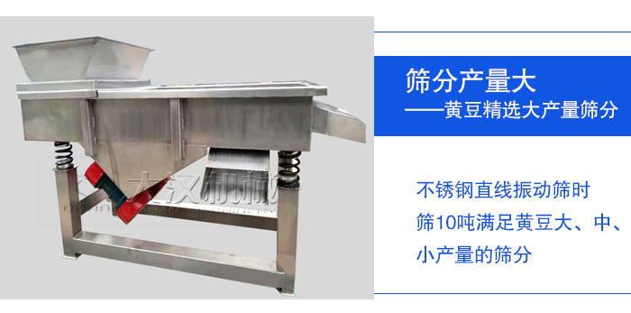 黃豆的顆粒大小在0.5mm-1.5mm之間,我們大漢生產的不銹鋼直線振動篩能滿足細至0.028mm以細顆粒或粉末狀物料篩分,粗至5mm大顆粒塊狀物料的篩分,其中多層的篩網安裝也能夠達到同時篩出不同規格物料的要求,適應多種規格的生產標準。而且不銹鋼直線振動篩還配備有彈跳球,在篩分過程中不停撞擊篩網,達到清網的目的,網孔不會堵塞,滿足精度的同時還能保證篩分效率。