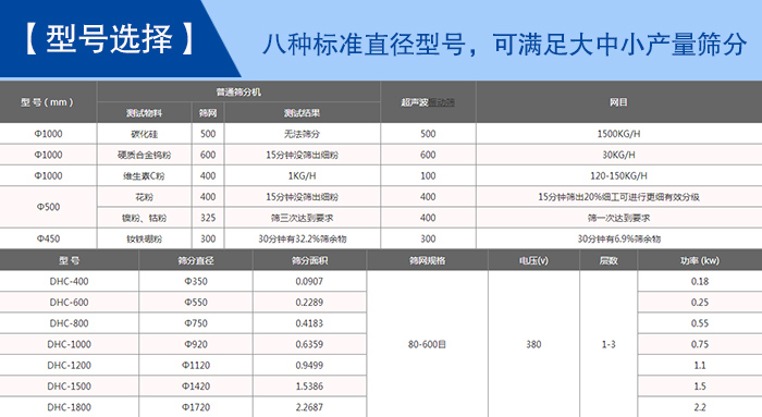 【型號選擇】—— DHC系列超聲波振動(dòng)篩型號有:DHC-400、DHC-600、DHC-800、DHC-1000、DHC-1200、DHC-1500、DHC-1800、DHC-2000等八種標(biāo)準(zhǔn)直徑型號,可滿足100目—600目的細(xì)網(wǎng)篩分,每小時(shí)500KG—3000KG的大中小產(chǎn)量篩分。