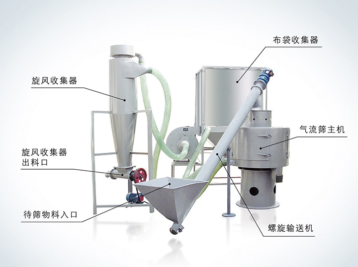 立式氣流篩分機外觀為立式,風輪葉片密集、風速高,向外噴射量大,產量比臥式氣流篩大,一般是礦產行業篩分粉料(重鈣粉等),要求被篩原料中細料90%以上,適用于細粉篩分,如面粉、石墨粉、橡膠粉、氧化鎂、珍珠巖粉、鐵粉、環氧樹脂粉等。但是立式氣流篩分機排料不方便,需要旋風除塵器和布袋除塵器組合使用。